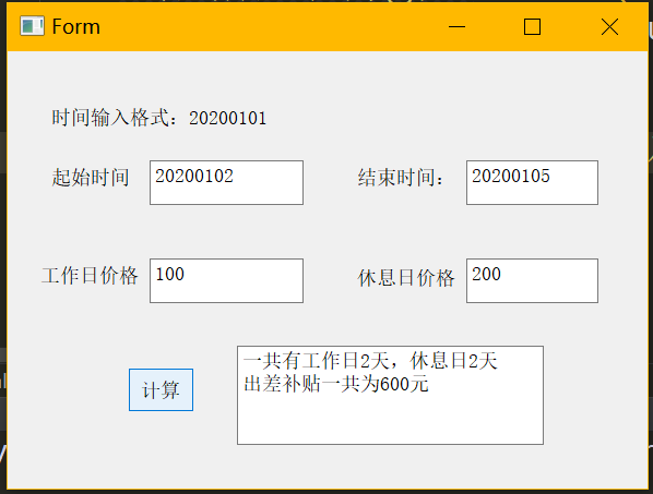 week = datetime.strptime(eachDay[0] + eachDay[1] + eachDay[2], "%Y%m%d").weekday() + 1 if week > 0 and week < 6: 工作日 += 1 else: 休息日 += 1 result = "一共有工作日{}天,休息日{}天\n".format(工作日, 休息日) +\ "出差补贴一共为{}元".format(工作日 * int(workday_price) + 休息日 * int(holiday_price)) self.textEdit_5.setText(result) except Exception : # 输入框制空并显示重新输入 self.textEdit_5.setText("输入格式有误\n请检查并重新输入") # self.textEdit.setText() # self.textEdit_2.setText() # self.textEdit_5.setText() # self.textEdit_6.setText()