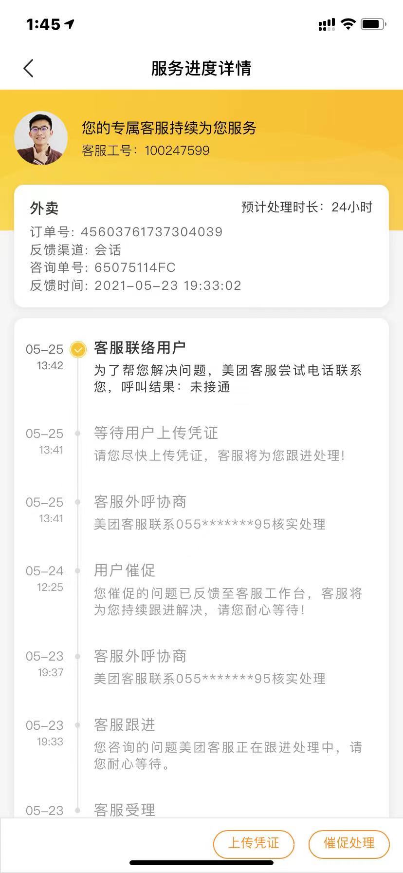 2021/5/25 13:44 美团客服处理状态更新显示未打通我的电话,但是并未接到电话